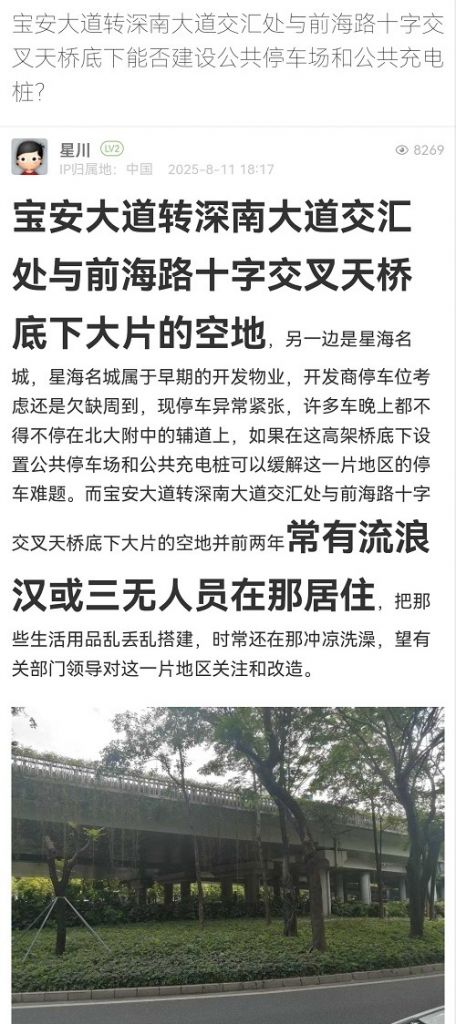 2. 帖文《寶安大道轉(zhuǎn)深南大道交匯處與前海路十字交叉天橋底下能否建設(shè)公共停車場和公共充電樁?》