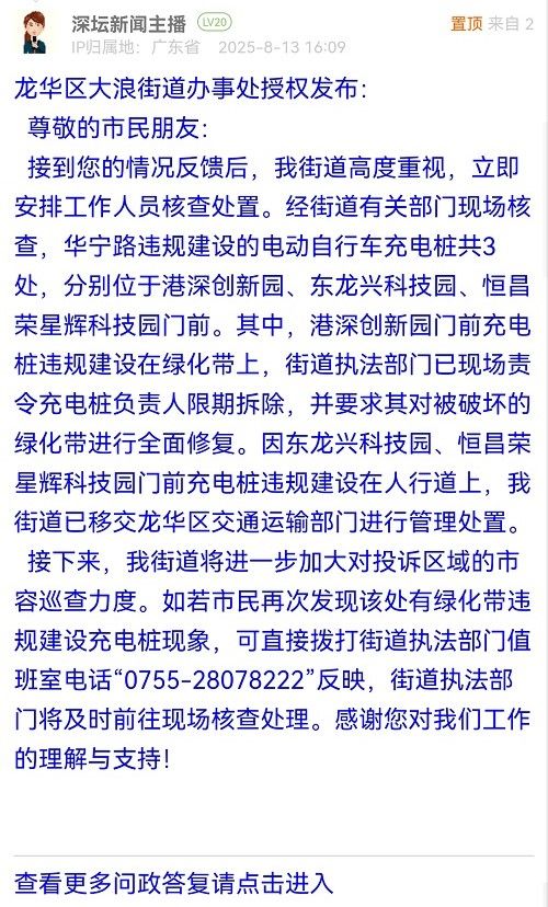 4. 帖文《龍華大浪街道綠化帶違規(guī)充電樁還在裝?》