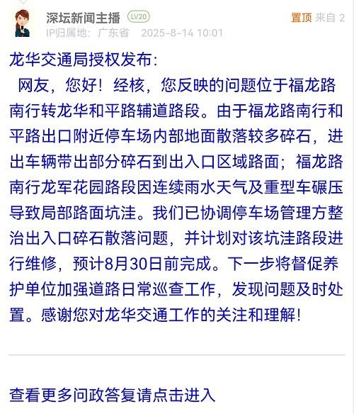 網(wǎng)友,您好!經(jīng)核,您反映的問題位于福龍路南行轉(zhuǎn)龍華和平路輔道路段。由于福龍路南行和平路出口附近停車場內(nèi)部地面散落較多碎石,進出車輛帶出部分碎石到出入口區(qū)域路面;福龍路南行龍軍花園路段因連續(xù)雨水天氣及重型車碾壓導(dǎo)致局部路面坑洼。我們已協(xié)調(diào)停車場管理方整治出入口碎石散落問題,并計劃對該坑洼路段進行維修,預(yù)計8月30日前完成。下一步將督促養(yǎng)護單位加強道路日常巡查工作,發(fā)現(xiàn)問題及時處置。感謝您對龍華交通工作的關(guān)注和理解!