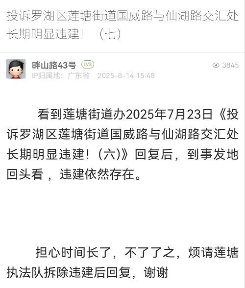 16. 帖文《投訴羅湖區(qū)蓮塘街道國威路與仙湖路交匯處長期明顯違建!(七)》