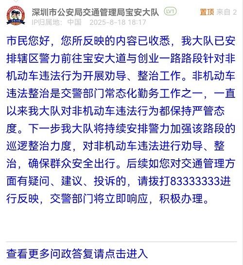 市民您好,您所反映的內(nèi)容已收悉,我大隊已安排轄區(qū)警力前往寶安大道與創(chuàng)業(yè)一路路段針對非機動車違法行為開展勸導(dǎo)、整治工作。非機動車違法整治是交警部門常態(tài)化勤務(wù)工作之一,一直以來我大隊對非機動車違法行為都保持嚴管態(tài)度。下一步我大隊將持續(xù)安排警力加強該路段的巡邏整治力度,對非機動車違法進行勸導(dǎo)、整治,確保群眾安全出行。后續(xù)如您對交通管理方面有疑問、建議、投訴的,請撥打83333333進行反映,交警部門將立即響應(yīng),積極辦理。