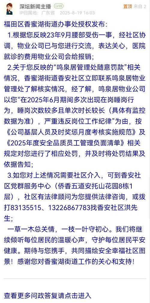 2.關(guān)于您反映的“鳴泉居管理處隨意罰款”相關(guān)情況,香蜜湖街道香安社區(qū)立即聯(lián)系鳴泉居物業(yè)管理處了解核實情況,經(jīng)了解,鳴泉居物業(yè)公司以您“在2025年6月期間多次出現(xiàn)在崗睡崗行為,睡崗次數(shù)較多且單次時長較長(具體有監(jiān)控數(shù)據(jù)為準),嚴重違反崗位工作紀律”為由,按《公司基層人員及時獎懲月度考核實施規(guī)范》及《2025年度安全品質(zhì)員工管理負面清單》相關(guān)規(guī)定對您進行了相應(yīng)處罰,并及時將處罰結(jié)果及依據(jù)告知;