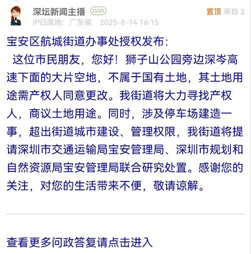 這位市民朋友,您好!獅子山公園旁邊深岑高速下面的大片空地,不屬于國有土地,其土地用途需產(chǎn)權(quán)人同意更改。我街道將大力尋找產(chǎn)權(quán)人,商議土地用途。同時,涉及停車場建造一事,超出街道城市建設(shè)、管理權(quán)限,我街道將提請深圳市交通運輸局寶安管理局、深圳市規(guī)劃和自然資源局寶安管理局聯(lián)合研究處置。感謝您的關(guān)注,對您的生活帶來不便,敬請諒解。
