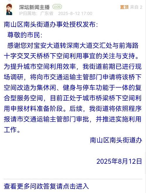 感謝您對寶安大道轉(zhuǎn)深南大道交匯處與前海路十字交叉天橋橋下空間利用事宜的關(guān)注與支持。為提升城市空間利用效率,我街道前期已進行現(xiàn)場調(diào)研,將向市交通運輸主管部門申請將該橋下空間改造為集休閑、健身與停車功能于一體的復(fù)合型服務(wù)空間,目前正處于城市橋梁橋下空間利用申報材料準備階段。后續(xù),我街道將依照程序報請市交通運輸主管部門審批,并推進實施利用工作。