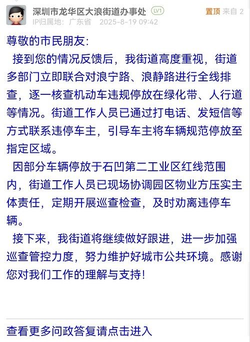 接到您的情況反饋后,我街道高度重視,街道多部門立即聯(lián)合對浪寧路、浪靜路進行全線排查,逐一核查機動車違規(guī)停放在綠化帶、人行道等情況。街道工作人員已通過打電話、發(fā)短信等方式聯(lián)系違停車主,引導(dǎo)車主將車輛規(guī)范停放至指定區(qū)域。