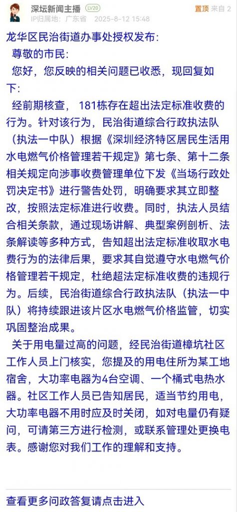 1. 帖文《投訴龍華民治樟坑一區(qū)181棟管理處加收水電費,電費高達2千元》