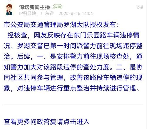 經(jīng)核查,網(wǎng)友反映存在東門樂園路車輛違停情況,羅湖交警已第一時間派警力前往現(xiàn)場違停整治。后續(xù),一、是安排警力前往現(xiàn)場核查處,通知警力加大對該路段違停的查處力度。二、是協(xié)同社區(qū)共同參與管理,改善該路段車輛違停的現(xiàn)象,對違停車輛進行重點整治并持續(xù)進行管理。