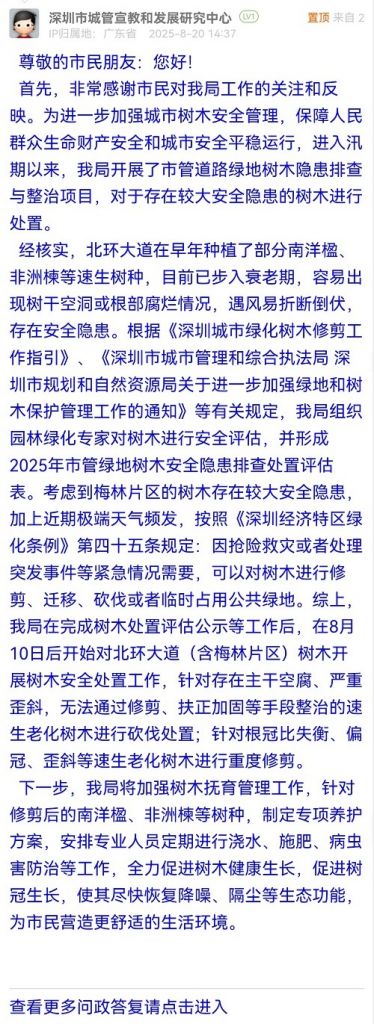 經(jīng)核實,北環(huán)大道在早年種植了部分南洋楹、非洲楝等速生樹種,目前已步入衰老期,容易出現(xiàn)樹干空洞或根部腐爛情況,遇風(fēng)易折斷倒伏,存在安全隱患。根據(jù)《深圳城市綠化樹木修剪工作指引》、《深圳市城市管理和綜合執(zhí)法局 深圳市規(guī)劃和自然資源局關(guān)于進一步加強綠地和樹木保護管理工作的通知》等有關(guān)規(guī)定,我局組織園林綠化專家對樹木進行安全評估,并形成2025年市管綠地樹木安全隱患排查處置評估表??紤]到梅林片區(qū)的樹木存在較大安全隱患,加上近期極端天氣頻發(fā),按照《深圳經(jīng)濟特區(qū)綠化條例》第四十五條規(guī)定:因搶險救災(zāi)或者處理突發(fā)事件等緊急情況需要,可以對樹木進行修剪、遷移、砍伐或者臨時占用公共綠地。綜上,我局在完成樹木處置評估公示等工作后,在8月10日后開始對北環(huán)大道(含梅林片區(qū))樹木開展樹木安全處置工作,針對存在主干空腐、嚴重歪斜,無法通過修剪、扶正加固等手段整治的速生老化樹木進行砍伐處置;針對根冠比失衡、偏冠、歪斜等速生老化樹木進行重度修剪。