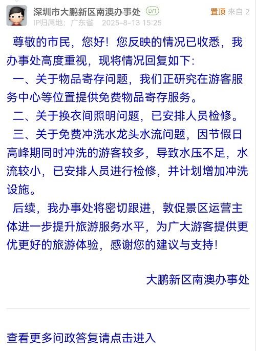 三、關(guān)于免費沖洗水龍頭水流問題,因節(jié)假日高峰期同時沖洗的游客較多,導(dǎo)致水壓不足,水流較小,已安排人員進行檢修,并計劃增加沖洗設(shè)施。