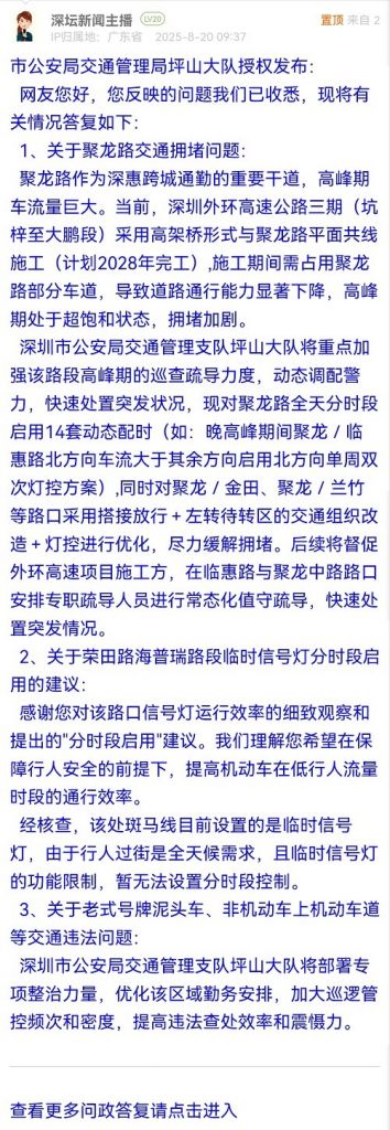 深圳市公安局交通管理支隊坪山大隊將重點加強該路段高峰期的巡查疏導(dǎo)力度,動態(tài)調(diào)配警力,快速處置突發(fā)狀況,現(xiàn)對聚龍路全天分時段啟用14套動態(tài)配時(如:晚高峰期間聚龍/臨惠路北方向車流大于其余方向啟用北方向單周雙次燈控方案),同時對聚龍/金田、聚龍/蘭竹等路口采用搭接放行+左轉(zhuǎn)待轉(zhuǎn)區(qū)的交通組織改造+燈控進行優(yōu)化,盡力緩解擁堵。后續(xù)將督促外環(huán)高速項目施工方,在臨惠路與聚龍中路路口安排專職疏導(dǎo)人員進行常態(tài)化值守疏導(dǎo),快速處置突發(fā)情況。