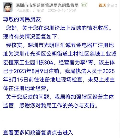 尊敬的網(wǎng)民朋友:您好,關(guān)于您在深圳論壇上反映的情況收悉?,F(xiàn)將有關(guān)情況回復(fù)如下:經(jīng)核實,深圳市光明區(qū)匯誠五金電器廠注冊地址為深圳市光明區(qū)公明街道上村社區(qū)蓮塘工業(yè)城宏恒泰工業(yè)園1棟304,經(jīng)營者為李*青,該主體已于2023年8月9日注銷。我局執(zhí)法人員于2025年8月15日前往注冊地址現(xiàn)場檢查,未見上述主體在注冊地址經(jīng)營。關(guān)于您反映的問題,我局將加強轄區(qū)經(jīng)營主體監(jiān)管,感謝您對我局工作的關(guān)心與支持。