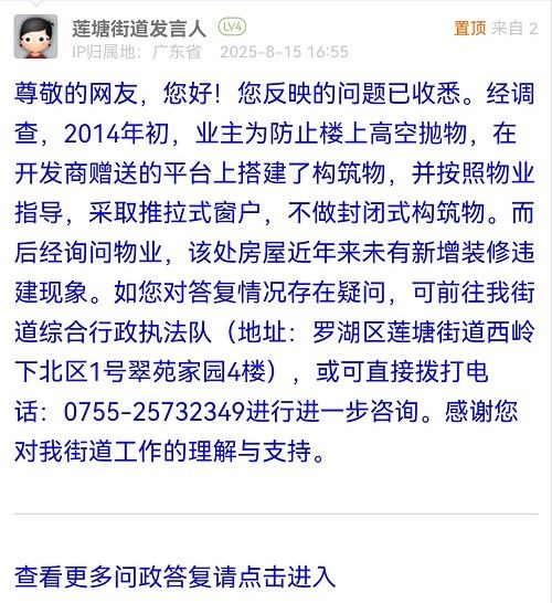 尊敬的網(wǎng)友,您好!您反映的問題已收悉。經(jīng)調(diào)查,2014年初,業(yè)主為防止樓上高空拋物,在開發(fā)商贈送的平臺上搭建了構(gòu)筑物,并按照物業(yè)指導(dǎo),采取推拉式窗戶,不做封閉式構(gòu)筑物。而后經(jīng)詢問物業(yè),該處房屋近年來未有新增裝修違建現(xiàn)象。如您對答復(fù)情況存在疑問,可前往我街道綜合行政執(zhí)法隊(地址:羅湖區(qū)蓮塘街道西嶺下北區(qū)1號翠苑家園4樓),或可直接撥打電話:0755-25732349進行進一步咨詢。感謝您對我街道工作的理解與支持。