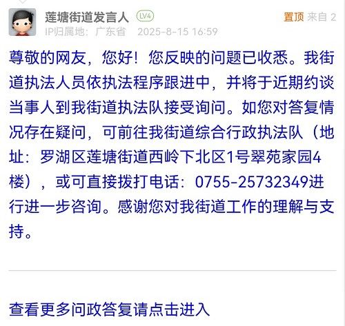 尊敬的網(wǎng)友,您好!您反映的問題已收悉。我街道執(zhí)法人員依執(zhí)法程序跟進中,并將于近期約談當事人到我街道執(zhí)法隊接受詢問。如您對答復(fù)情況存在疑問,可前往我街道綜合行政執(zhí)法隊(地址:羅湖區(qū)蓮塘街道西嶺下北區(qū)1號翠苑家園4樓),或可直接撥打電話:0755-25732349進行進一步咨詢。感謝您對我街道工作的理解與支持。