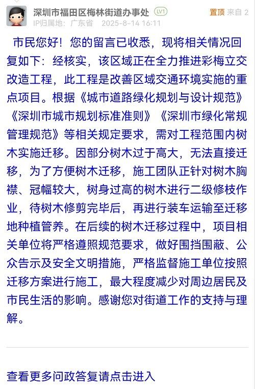 市民您好!您的留言已收悉,現(xiàn)將相關(guān)情況回復(fù)如下:經(jīng)核實,該區(qū)域正在全力推進彩梅立交改造工程,此工程是改善區(qū)域交通環(huán)境實施的重點項目。根據(jù)《城市道路綠化規(guī)劃與設(shè)計規(guī)范》《深圳市城市規(guī)劃標準準則》《深圳市綠化常規(guī)管理規(guī)范》等相關(guān)規(guī)定要求,需對工程范圍內(nèi)樹木實施遷移。因部分樹木過于高大,無法直接遷移,為了方便樹木遷移,施工團隊正針對樹木胸襟、冠幅較大,樹身過高的樹木進行二級修枝作業(yè),待樹木修剪完畢后,再進行裝車運輸至遷移地種植管養(yǎng)。在后續(xù)的樹木遷移過程中,項目相關(guān)單位將嚴格遵照規(guī)范要求,做好圍擋圍蔽、公眾告示及安全文明措施,嚴格監(jiān)督施工單位按照遷移方案進行施工,最大程度減少對周邊居民及市民生活的影響。感謝您對街道工作的支持與理解。