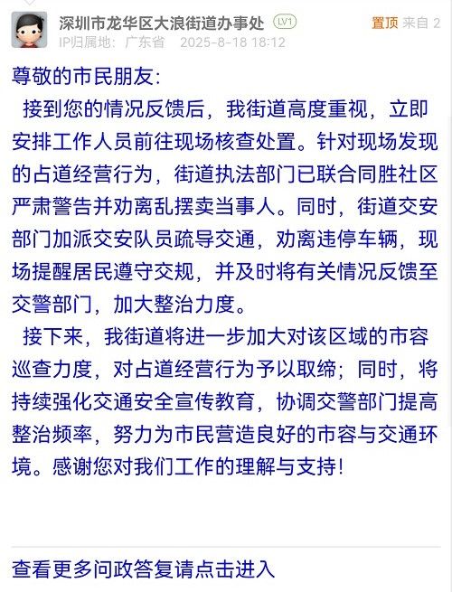 接下來,我街道將進一步加大對該區(qū)域的市容巡查力度,對占道經(jīng)營行為予以取締;同時,將持續(xù)強化交通安全宣傳教育,協(xié)調(diào)交警部門提高整治頻率,努力為市民營造良好的市容與交通環(huán)境。感謝您對我們工作的理解與支持!
