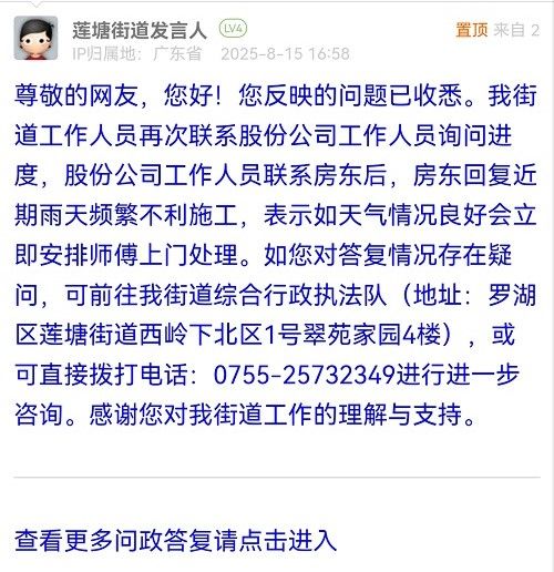 尊敬的網(wǎng)友,您好!您反映的問題已收悉。我街道工作人員再次聯(lián)系股份公司工作人員詢問進度,股份公司工作人員聯(lián)系房東后,房東回復(fù)近期雨天頻繁不利施工,表示如天氣情況良好會立即安排師傅上門處理。如您對答復(fù)情況存在疑問,可前往我街道綜合行政執(zhí)法隊(地址:羅湖區(qū)蓮塘街道西嶺下北區(qū)1號翠苑家園4樓),或可直接撥打電話:0755-25732349進行進一步咨詢。感謝您對我街道工作的理解與支持。