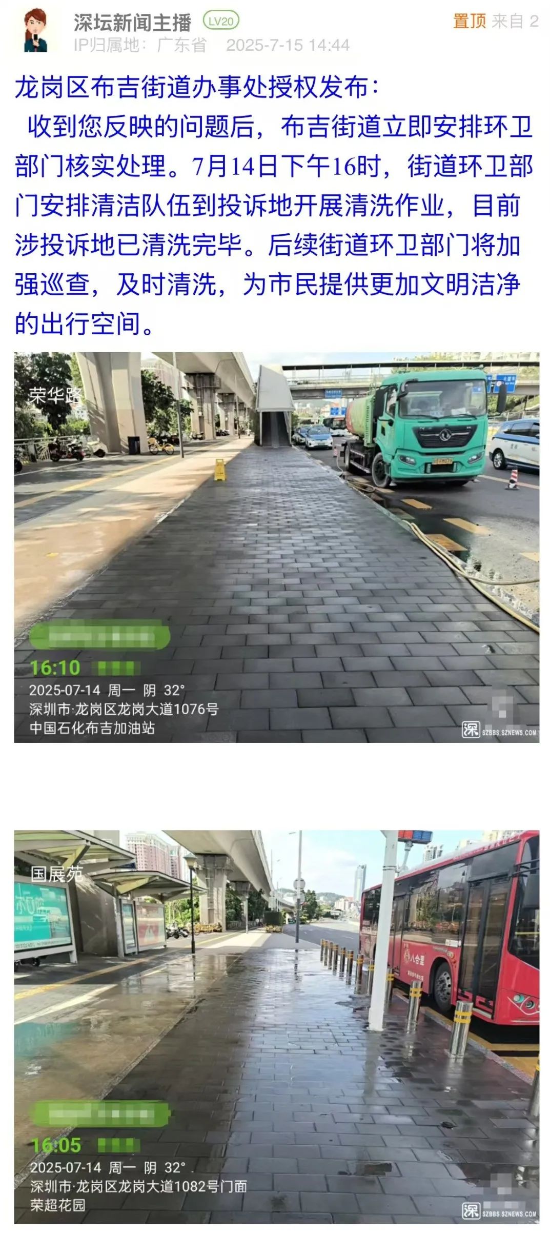 案例點評:對于市民反映的路面油污問題,布吉街道辦立即安排環(huán)衛(wèi)部門進行清洗,并于第二日在問政帖文下進行回復(fù),以現(xiàn)場圖片展示路面清理效果,表示將加強后續(xù)巡查。此次處置展現(xiàn)了基層部門高效務(wù)實的問題處理能力,為城市道路環(huán)境管理提供了快速響應(yīng)與長效維護相結(jié)合的實踐范例,切實回應(yīng)了市民對潔凈環(huán)境的期待。