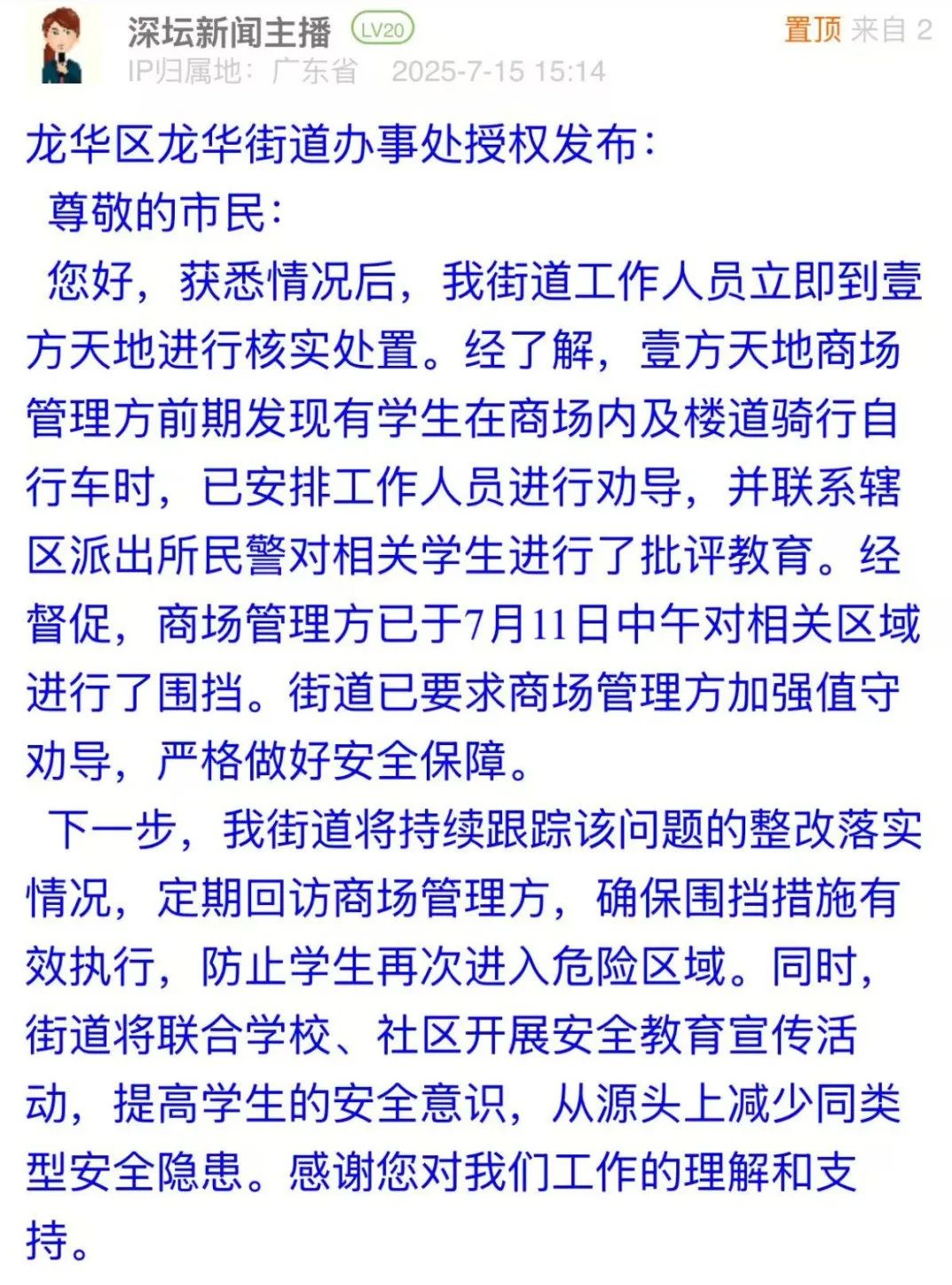 2、有市民反映龍華區(qū)壹方天地內(nèi)有學(xué)生危險騎行,質(zhì)疑商場安全監(jiān)管不足