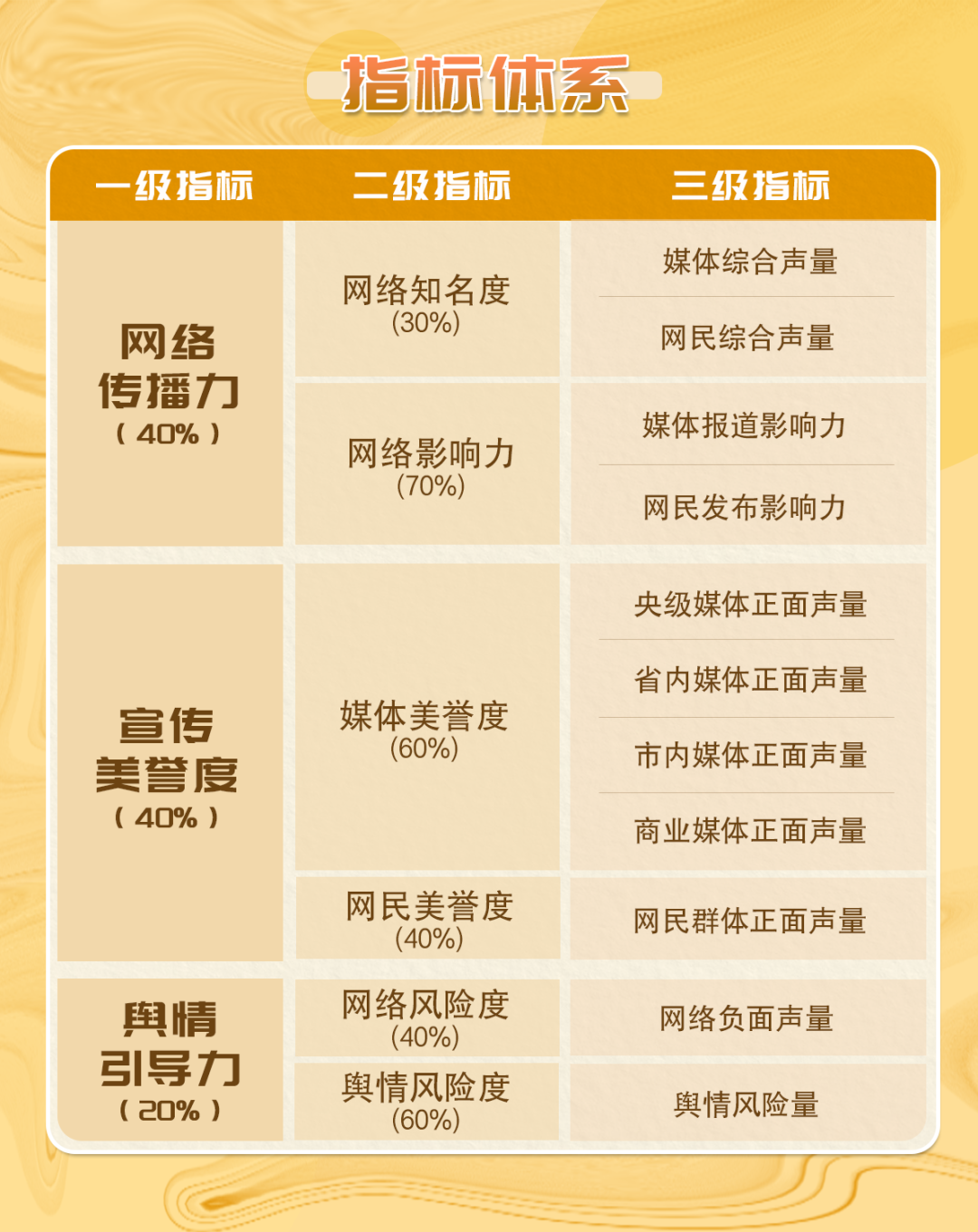 《深圳各街道網(wǎng)絡(luò)形象及影響力榜》具有科學(xué)、可信、量化的指標評價體系,能夠全面客觀地評估各街道的網(wǎng)絡(luò)綜合形象及影響力值。具體指標體系如下圖所示↓