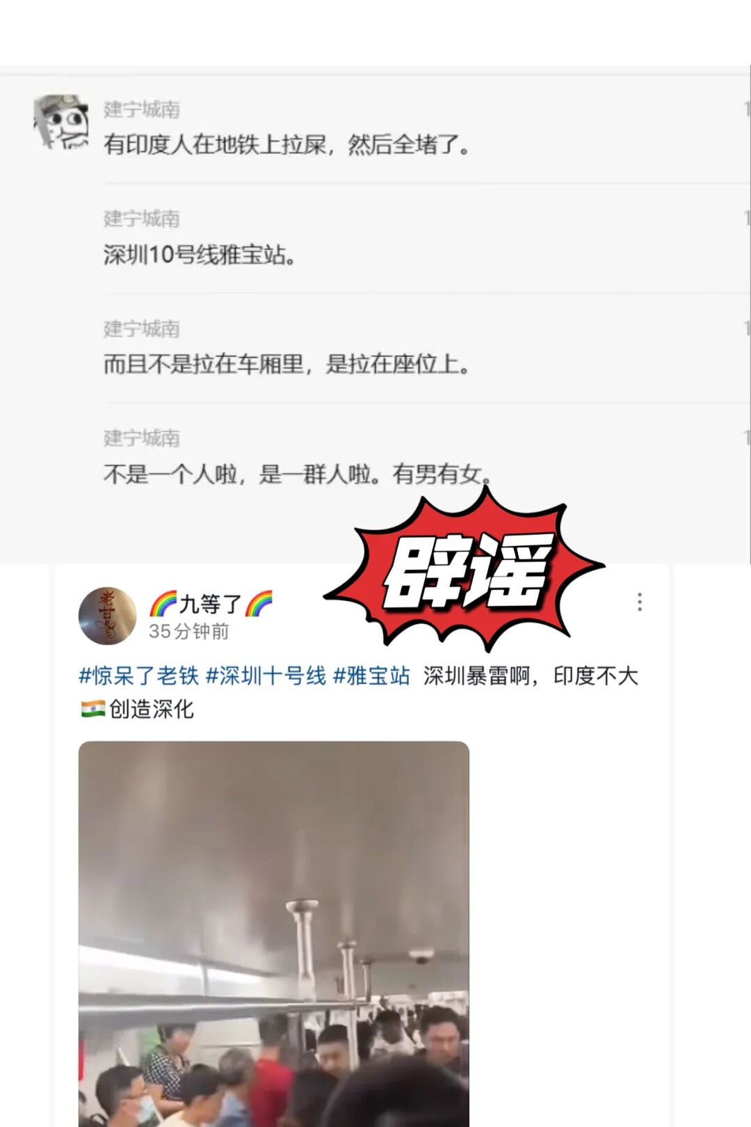 近日,在抖音、小紅書(shū)等平臺(tái),有用戶(hù)傳播“印度人在深圳地鐵大便”的消息,并搭配乘客在地鐵車(chē)廂內(nèi)往同一方向奔走的視頻。