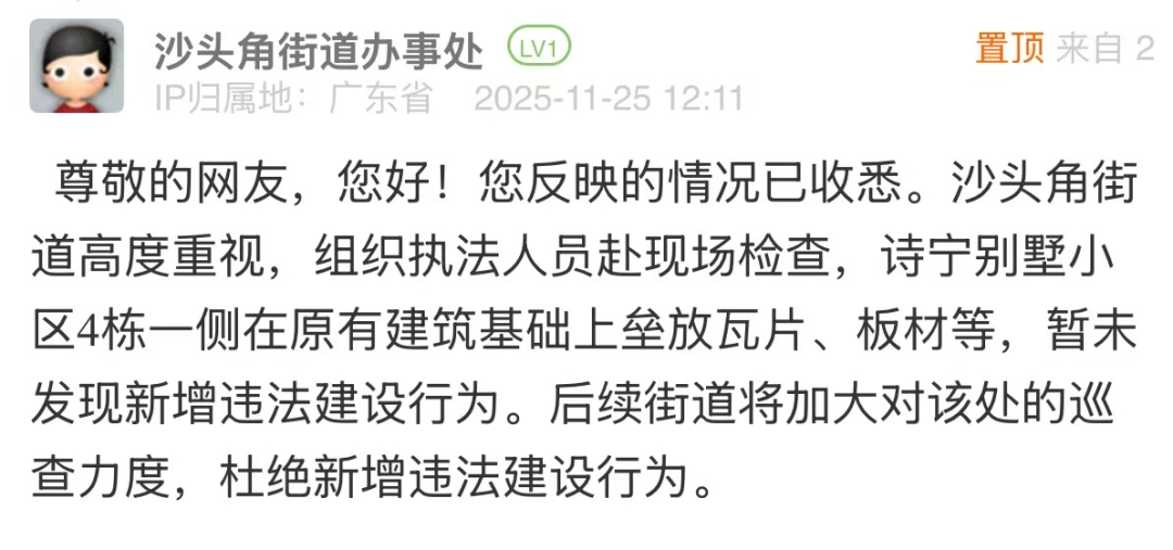 優(yōu)化建議:針對網(wǎng)民投訴的小區(qū)違建問題,街道回應僅以“未發(fā)現(xiàn)新增違法建設(shè)行為”簡單回復,尚有完善空間。若該點位存在建設(shè)年代久遠、權(quán)屬界定模糊、涉及多主體協(xié)調(diào)等客觀難點,可適度說明,并在回應中補充核查細節(jié),說明后續(xù)處置方向與階段計劃,讓回應更具可信度和實操性,回應市民對“依法履職”的期待。