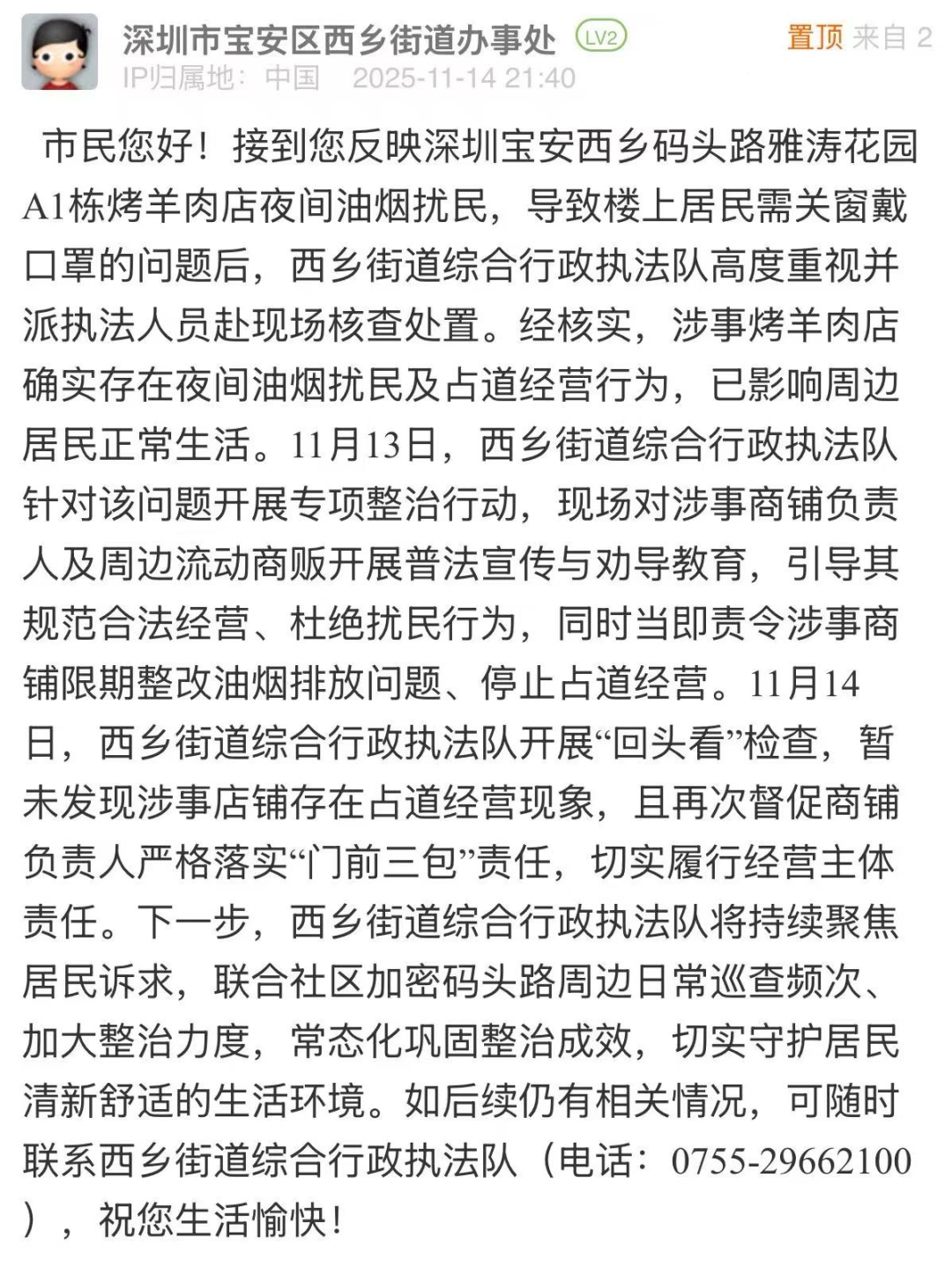 案例點評:接到市民反映后,街道迅速響應,當日開展核查,次日回應進展,處置高效。針對涉事店鋪油煙問題,執(zhí)法隊不僅現(xiàn)場開展普法勸導,責令商鋪限期整改,更在次日開展“回頭看”檢查,及時跟進整改進度、壓實經(jīng)營主體責任?;貞校值烂鞔_下一步將聯(lián)合社區(qū)加密日常巡查、加大整治力度,常態(tài)化鞏固整治成效,體現(xiàn)出緊盯民生痛點、深耕基層精細化治理、全力守護居民舒適生活環(huán)境的決心。
