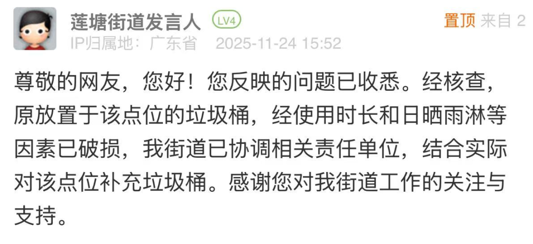 案例點評:針對市民反映“垃圾桶無故取消”的問題,街道辦在3小時內(nèi)完成核查,清晰說明垃圾桶搬離原因,同時迅速協(xié)調(diào)相關(guān)責任單位,結(jié)合實際情況明確將為該點位補充垃圾桶,切實解決群眾投放垃圾的剛需。此次處置迅速有效,既體現(xiàn)了直面民生訴求、不推諉不拖延的工作態(tài)度,也展現(xiàn)了精細化治理能力,為后續(xù)環(huán)衛(wèi)設(shè)施維護和民生需求響應提供了范本。