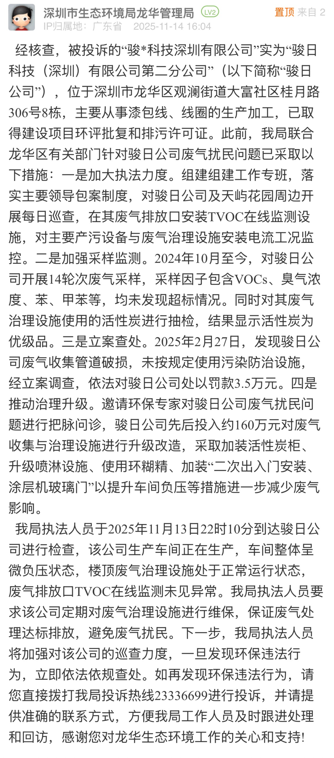 優(yōu)化建議:針對市民反映的工業(yè)廢氣擾民問題,相關(guān)部門雖采取巡查監(jiān)測、立案查處、推動設(shè)備升級等舉措,但未能實質(zhì)性化解居民困擾。在該問政網(wǎng)帖的評論區(qū),有多位業(yè)主留言反映,近一年來“天天聞到臭氣”,并對“采樣均未發(fā)現(xiàn)超標情況”的回復表示質(zhì)疑。建議相關(guān)部門在依托專業(yè)設(shè)備檢測的同時,結(jié)合居民“嗅辨”反饋開展精準溯源,切實回應群眾對清新環(huán)境的基本訴求,推動治理從“數(shù)據(jù)達標”轉(zhuǎn)向“群眾滿意”。