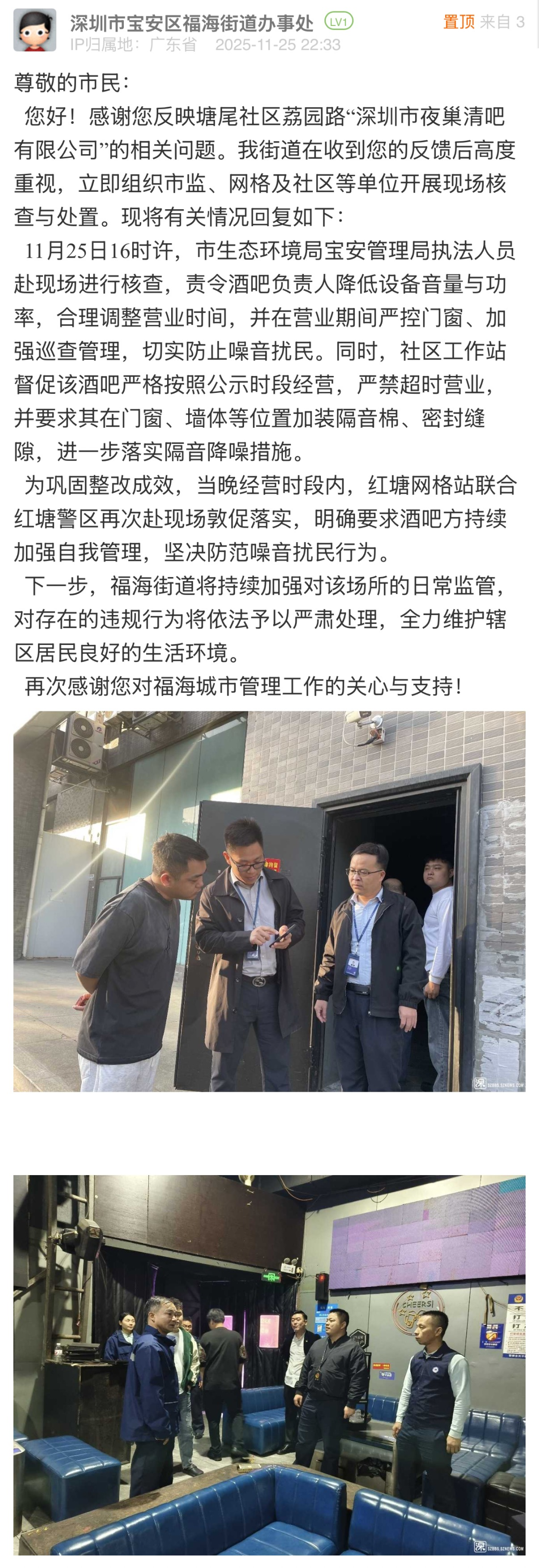案例點評:針對市民反映的問題,福海街道辦與市生態(tài)環(huán)境局寶安管理局快速響應、協(xié)同處置,在24小時內(nèi)組織工作人員開展線下核查,現(xiàn)場責令店鋪整改,嚴禁其超時營業(yè),并要求加裝隔音棉、密封縫隙,加強降噪。在發(fā)出整改要求當晚,網(wǎng)格站聯(lián)合警區(qū)再次到現(xiàn)場復查,督促整改要求落實,同時公開執(zhí)法圖片向公眾反饋處置進展,有效回應市民關(guān)切,體現(xiàn)了務實高效的工作作風。
