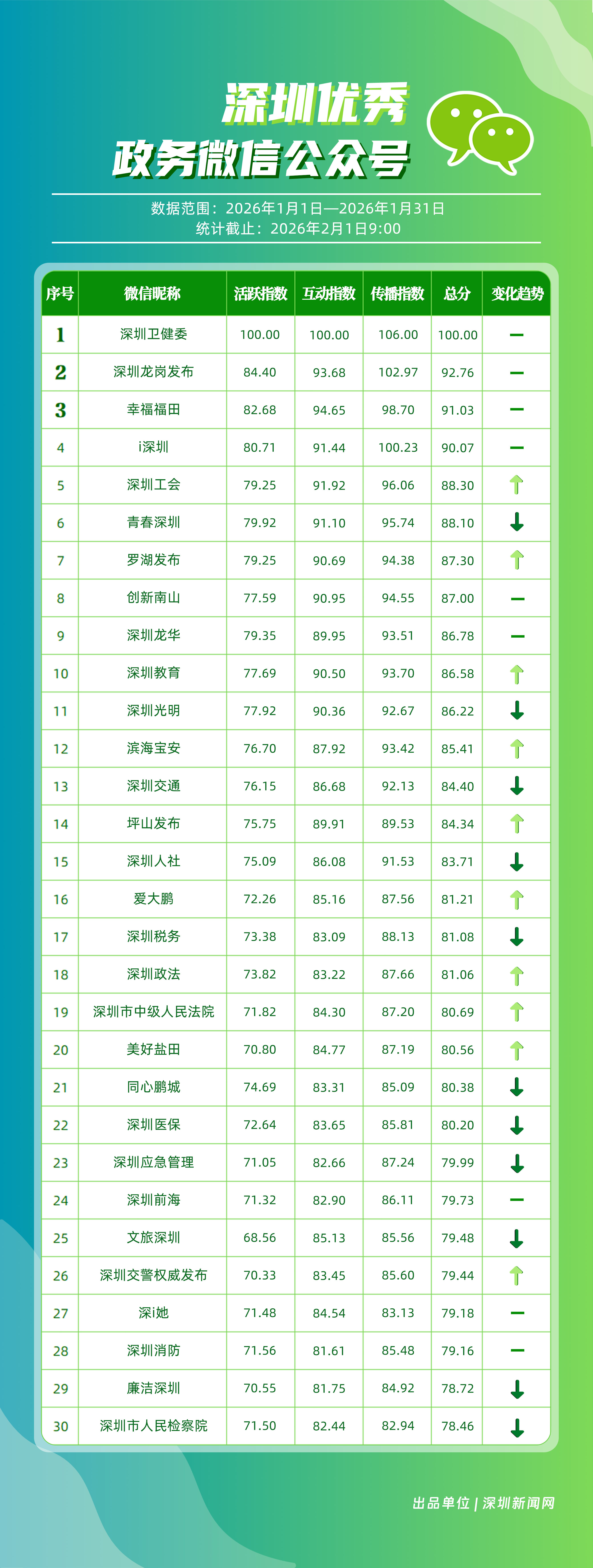 2026年1月,“深圳衛(wèi)健委”“深圳龍崗發(fā)布”“幸福福田”“i深圳”“深圳工會(huì)”“青春深圳”“羅湖發(fā)布”“創(chuàng)新南山”“深圳龍華”“深圳教育”等30個(gè)政務(wù)微信公眾號(hào)榮登“深圳優(yōu)秀政務(wù)微信公眾號(hào)”榜單。1月,頭部賬號(hào)“深圳衛(wèi)健委”繼續(xù)保持領(lǐng)先優(yōu)勢(shì),1月份有59篇文章閱讀量突破10萬(wàn)次,總分100分,穩(wěn)居榜首;“深圳龍崗發(fā)布”在互動(dòng)與傳播方面表現(xiàn)依然出色,總分102.97分,位列第二;“幸福福田”憑借均衡、穩(wěn)健的運(yùn)營(yíng),在互動(dòng)與傳播方面表現(xiàn)優(yōu)異,總分91.03分,排名第三。同時(shí),“深圳工會(huì)”與“羅湖發(fā)布”等賬號(hào)排名相較2025年12月有所提升。上榜微信公眾號(hào)持續(xù)深耕內(nèi)容與服務(wù),不斷拓展發(fā)布維度與深化應(yīng)用場(chǎng)景,在提升政務(wù)信息傳播效能、精準(zhǔn)對(duì)接民生需求方面,發(fā)揮了關(guān)鍵作用。