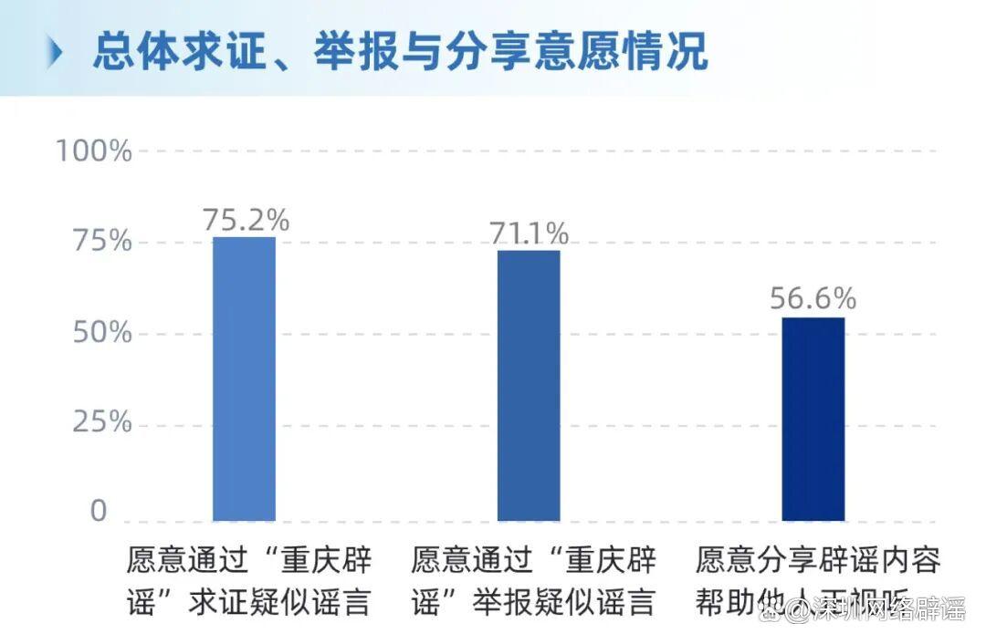 ·愿意通過“重慶辟謠”求證疑似謠言的占75.2%,愿意通過“重慶辟謠”舉報疑似謠言的占71.1%,愿意分享辟謠內(nèi)容幫助他人正視聽的占56.6%。
