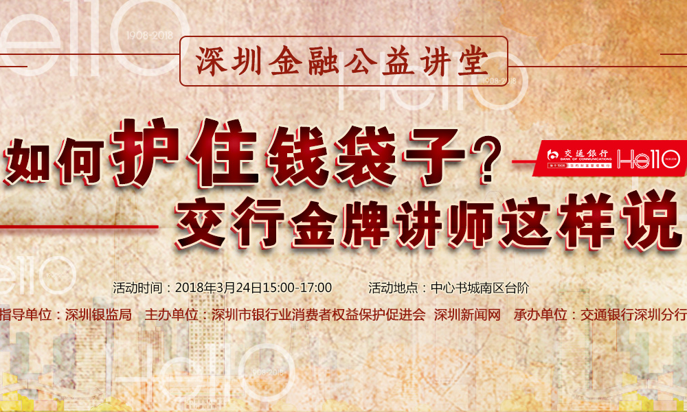3月24日,深圳新聞網(wǎng)攜手深圳市銀行業(yè)消費者權(quán)益保護促進(jìn)會舉辦的《深圳金融公益講堂》,將邀請交通銀行深圳分行金牌講師,結(jié)合110周年熱點,回顧交行百年歷史變遷,分析2018年理財趨勢,著眼消費者權(quán)益保護話題,以實際案例,深入淺出地開展一堂內(nèi)容豐富實用的金融大講堂。
