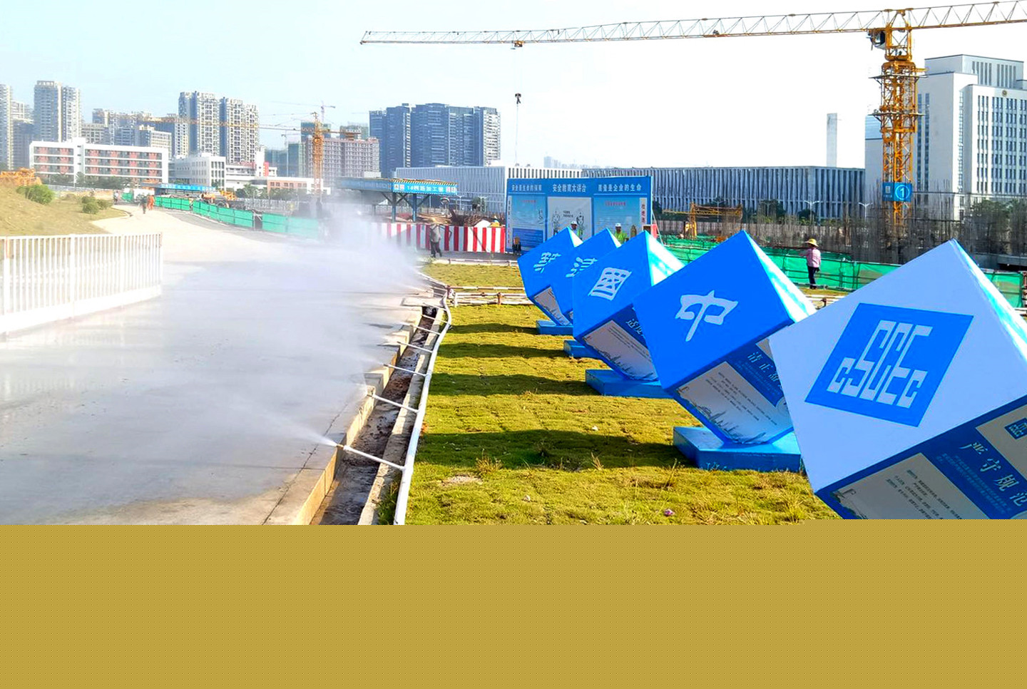 日前,在觀瀾街道地鐵四號(hào)線4302標(biāo)段施工工地上空,四套高聳的塔吊噴霧系統(tǒng)格外引人注目。